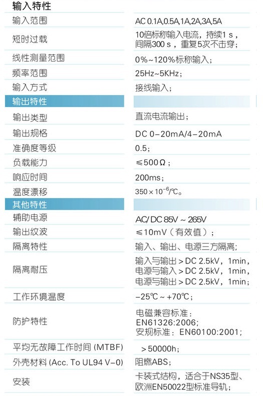 本产品采用特制隔离模块,对电网和电路中的交流电流进行实时测量,将其变换为4mA~20mA或0mA~20mA直流电流(IZ)输出;具有高精度、高隔离、低功耗、低漂移、温度范围宽、抗干扰能力强等特点。本产品采用卡装式结构,端子接线,安装方便,使用交流220V电源供电,输入、输出、电源之间两两隔离。