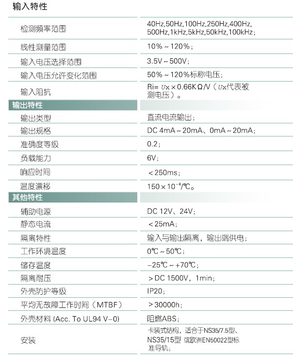 本产品采用光电隔离技术和F/V转换技术,对电网或电路中的频率信号进行实时测量,将频率信号变换为标准直流电流信号(Iz)输出;具有高精度、高隔离、低漂移、低功耗、宽温度范围等特点。本产品采用卡装式结构,端子接线,安装方便,适用于正弦波、非正弦波的频率测量。