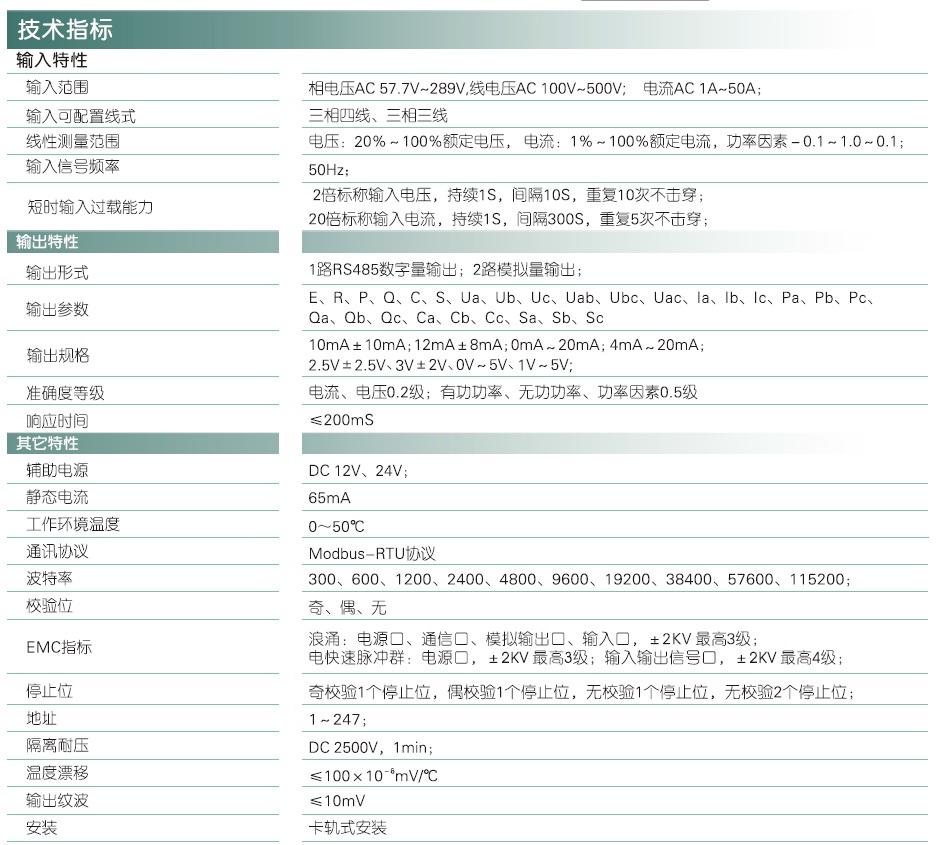 本产品采用特制隔离模块、专业MCU控制器、高速数据同步采集和数据快速处理技术,隔离测量三相三线、三相四线电路,分别将其变换为RS485总线和可配置模拟量输出。具有高精度、高隔离、抗干扰能力强等特点。本产品采用卡装式结构,带锁定螺钉的插拔式端子接线,分体式电流测头,安装、维护方便,适用于道岔转折机监测系统、工控监测系统等。