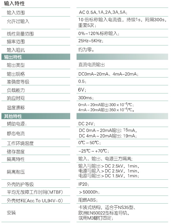 本产品采用特制隔离模块,对电网和电路中的交流电流进行实时测量,将其变换为0mA~20mA或4mA~20mA直流电流(IZ)输出;具有高精度、高隔离、宽频响、低漂移、低功耗、温度范围宽、抗干扰能力强等特点。本产品采用卡装式结构,端子接线,安装方便,适用于电源设备、电力网监测自动化系统、工控监测系统、铁路信号系统等。