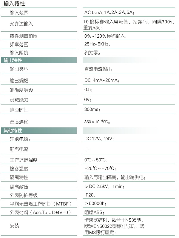 本产品采用特制隔离模块,对电网和电路中的交流电流进行实时测量,将其变换为二线制的4mA~20mA直流电流(IZ)输出;具有高精度、高隔离、功耗低、低漂移、温度范围宽、抗干扰能力强等特点。本产品采用卡装式结构,端子接线,安装方便,适用于电源设备、电力网监测自动化系统、工控监测系统、铁路信号系统等。